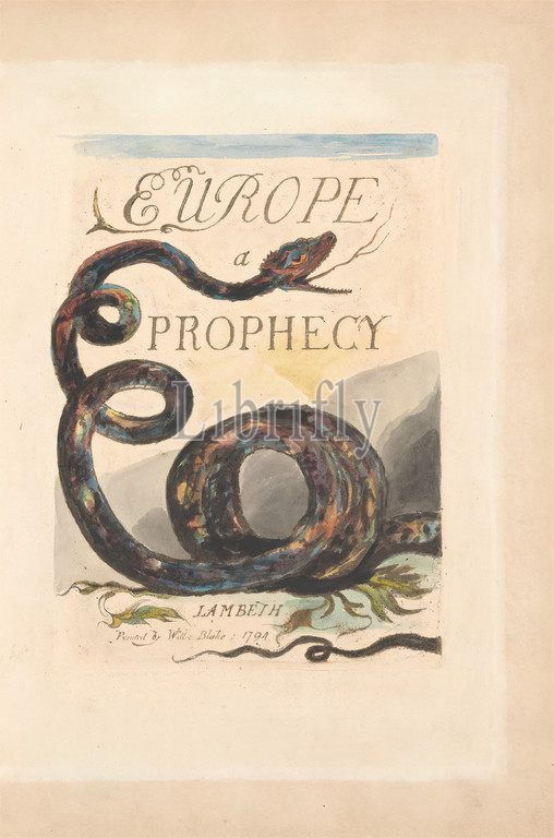 Europe., Prophecy, Plate 2, Title Page, Print, William Blake, 1757–1827, British, 1794, Color-printed relief etching, dark brown, pen, black ink, oil, watercolor, moderately thick, slightly textured, cream wove paper inlaid, size, Sheet, Plate, Spine, 15 3, 8 inches, 39.1 cm, leaf, plants, religious, mythological subject, serpent, snake, text