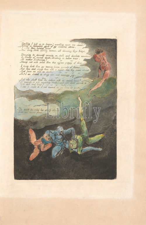 Europe. A Prophecy, Plate 4, 'Unwilling I look up . . . . ' (Bentley 5), Print made by William Blake, 1757–1827, British, 1794, Color-printed relief etching in dark brown with pen and black ink, oil and watercolor on moderately thick, slightly textured, cream wove paper inlaid to size, Sheet: 14 3/4 x 10 1/2 inches (37.5 x 26.7 cm), Plate: 9 1/2 x 6 3/4 inches (24.1 x 17.1 cm), and Spine: 15 3/8 inches (39.1 cm), bald, clouds, men, night, nudes, religious and mythological subject, text