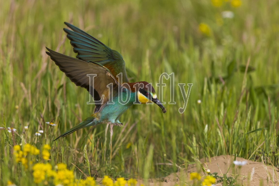 European Bee-eater in flight with prey, Merops apiaster, Italy