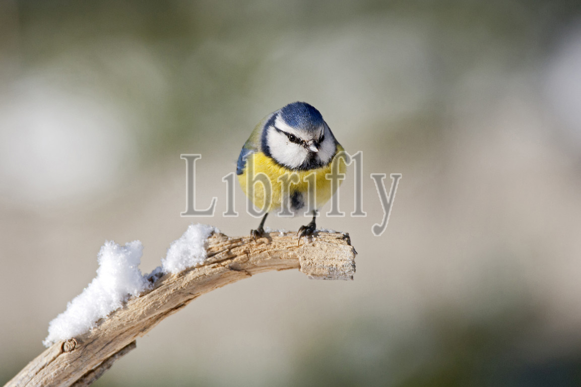 European Blue Tit perched on a branch with snow