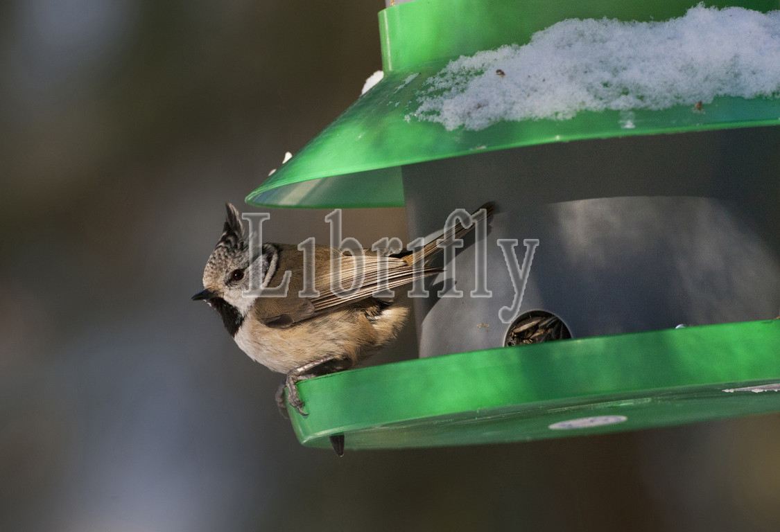 European Crested Tit perched on a feeder, Lophophanes cristatus, Finland