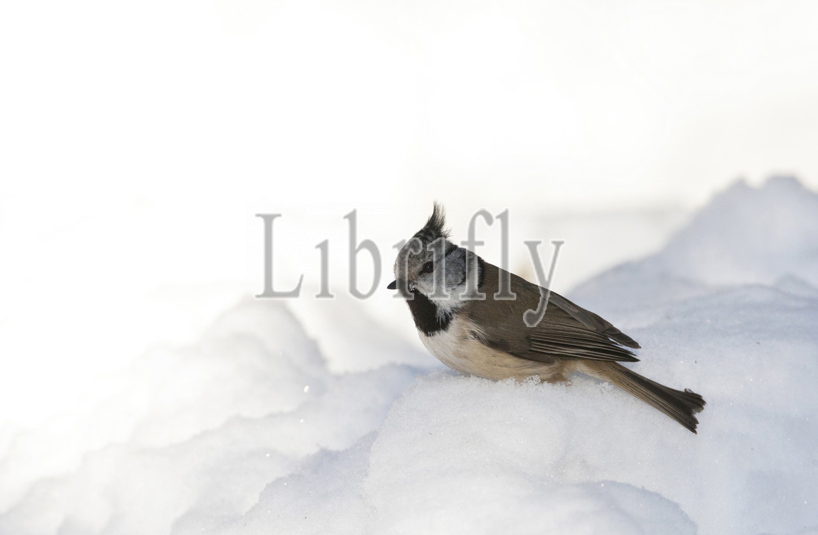 European Crested Tit perched in the snow, Lophophanes cristatus, Finland
