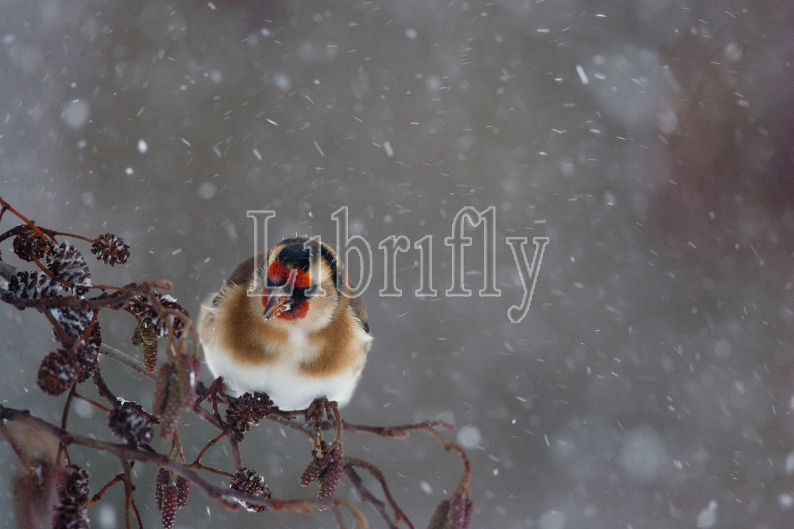 European Goldfinch foraging in blizzard, Carduelis carduelis