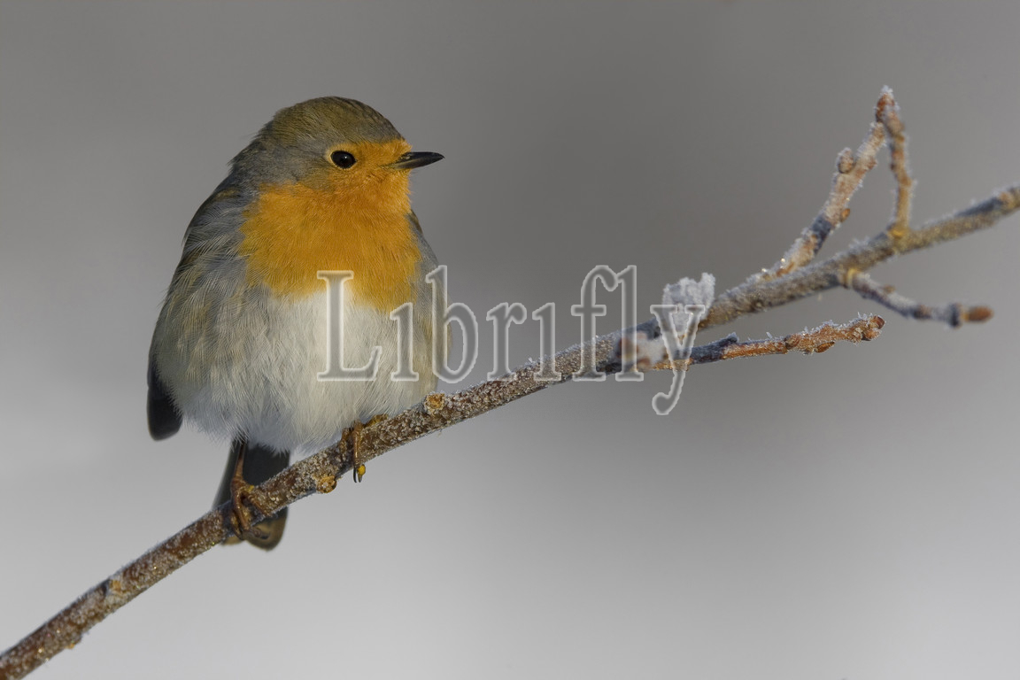European Robin perched in snow, Erithacus rubecula, Italy