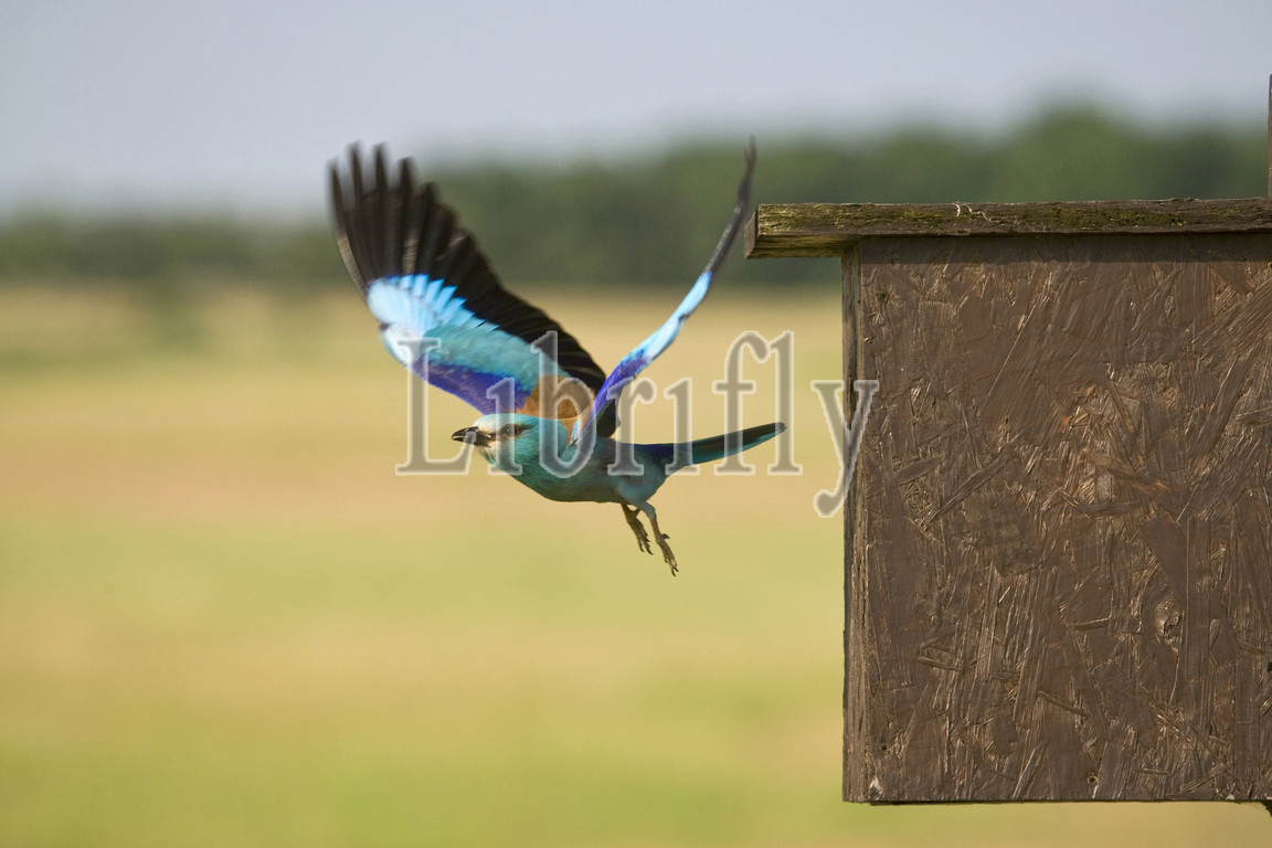 European Roller at nest box, Coracias garrulus