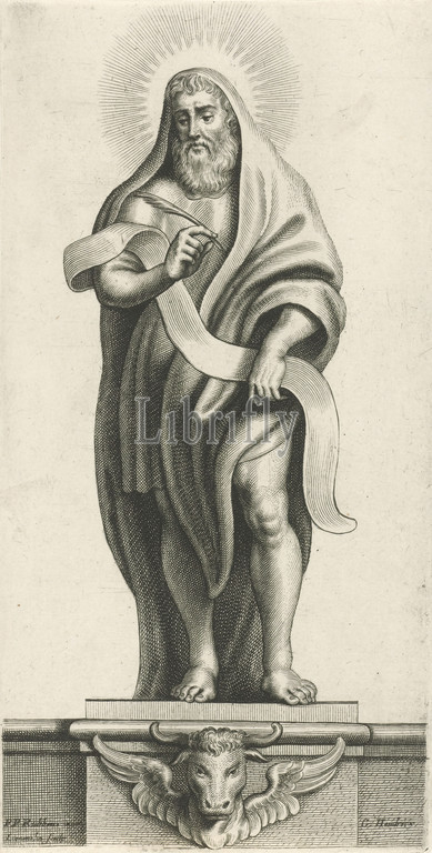 Evangelist Lucas Four evangelists, series title, Lucas, evangelist, writing spring, hands, base, evangelist stands, decorated, winged bull, print, part, four-part series, representations, four evangelists, Luke, possible attributes, book, winged, ox, portrait, Virgin, surgical instruments, painter's utensils, scroll, Adriaen Lommelin, mentioned, object, Antwerp, 1630, 1677, paper, engraving