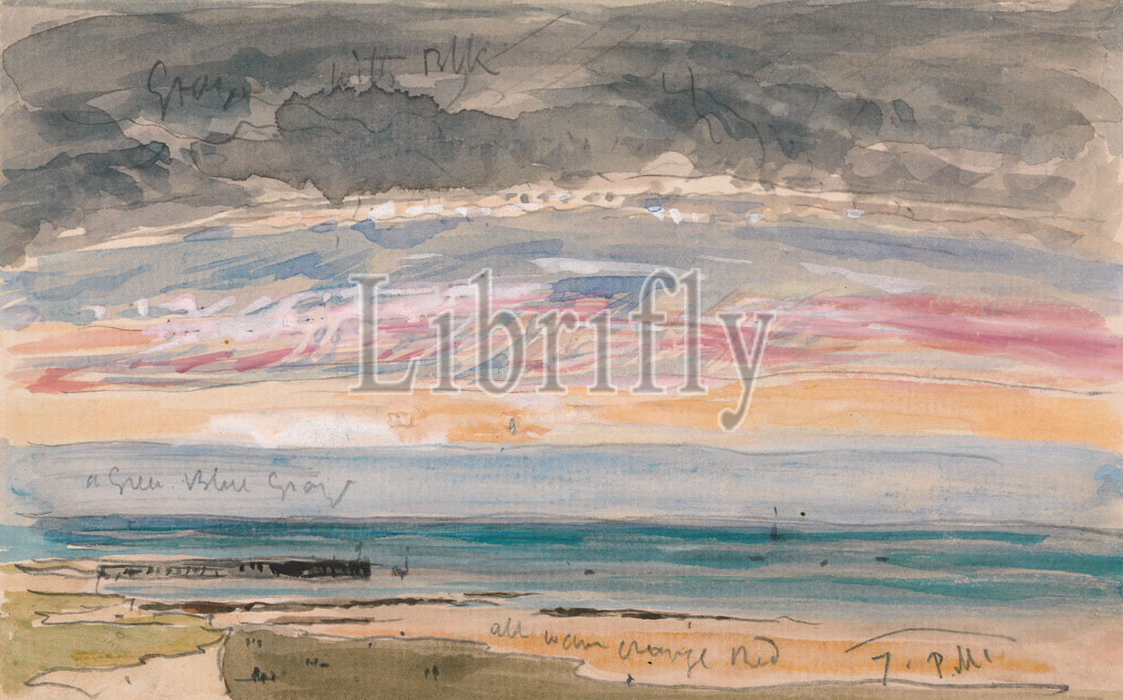 Evening Sky, Coast, James Holland, 1799–1870, British, 1859, 1861, Watercolor, graphite, white gouache, medium, slightly textured, cream laid paper, Sheet, abstract art, coast, evening, light, marine art, sand, sky, sunset