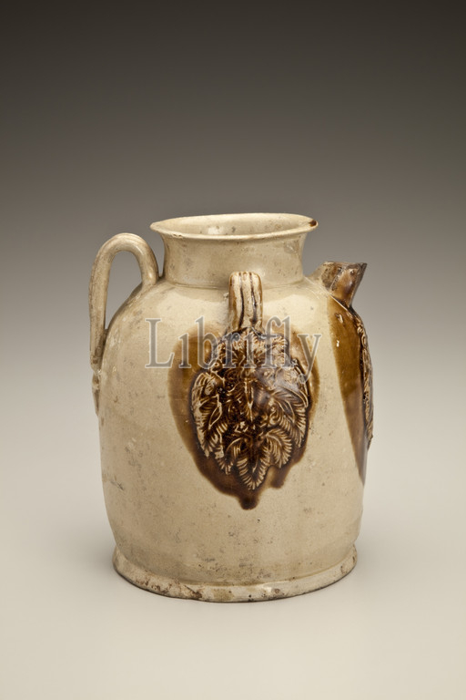 ewer with medallion appliqués of foliage and birds, Tang dynasty, Tang dynasty, 800s, stoneware with glaze, Changsha ware, 6-1/2 x 5-1/2 (diam.) in., Asian Art