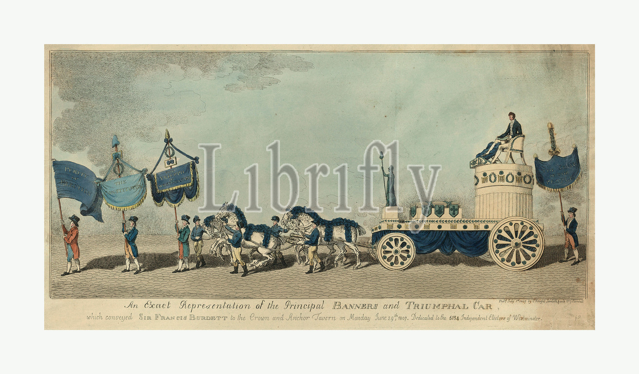 An Exact Representation of the Principal Banners and Triumphal Car, which Conveyed Sir Frances Burdett to the Crown and Anchor Tavern on Monday June 29th, 1807 - Dedicated to the 5134 Independent Electors of Westminster, Engraving 1807 July, Three Men with Banners Leading a Four-Horse Team Drawing a Carriage with a Statue of Britannia Holding a Staff Topped with a Liberty Cap, Two Fasces on a Low Platform, and Sir Frances Burdett Sitting in a Chair Atop a Short Column, Another Man with a Banner Follows behind the Carriage.