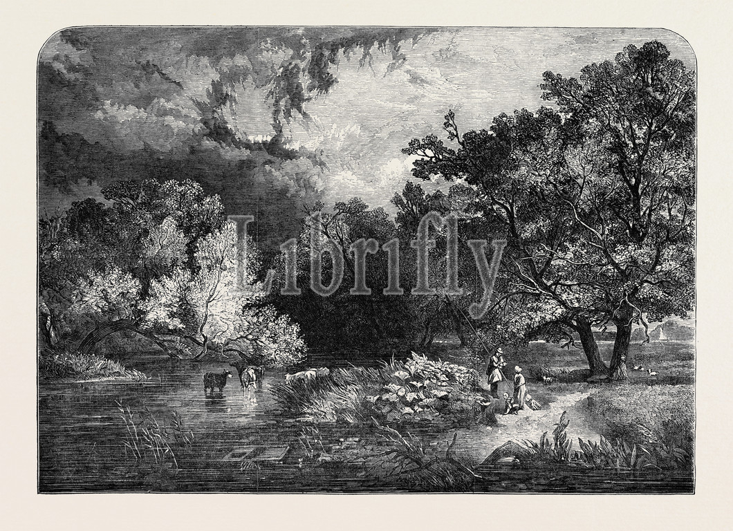 display of works of art, exhibition, national institution, woodland, waterway, stream, river, painted, s.r., percy, 1850 engraving, engraved image, history, illustrative technique, engravement, victorian, arts, culture, retro styled, vintage, retro, arkheia