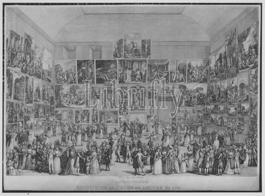 Exposition au Salon du Louvre en 1787, 1787, Etching and engraving, image: 12 11/16 x 19 5/16 in. (32.2 x 49.1 cm), Prints, Pietro Antonio Martini (Italian, Trescali 1738–1797 Parma), After Johann Heinrich Ramberg (German, Hanover 1763–1840 Hanover)