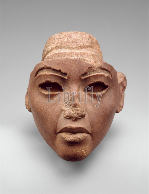 Face, Composite Statue, Queen Tiye, New Kingdom, Amarna Period, Dynasty 18, ca, 1353–1336 B.C, Egypt, Middle Egypt, Amarna, Akhetaten, Quartzite, H, 13.3 cm, 5 1/4, W, 12.5, 4 15/16, D, 12.4 7/8, quartzite, head, composite statue, several different, materials, Based, color, stone, red, conventional color, men, owner, originally identified, Akhenaten