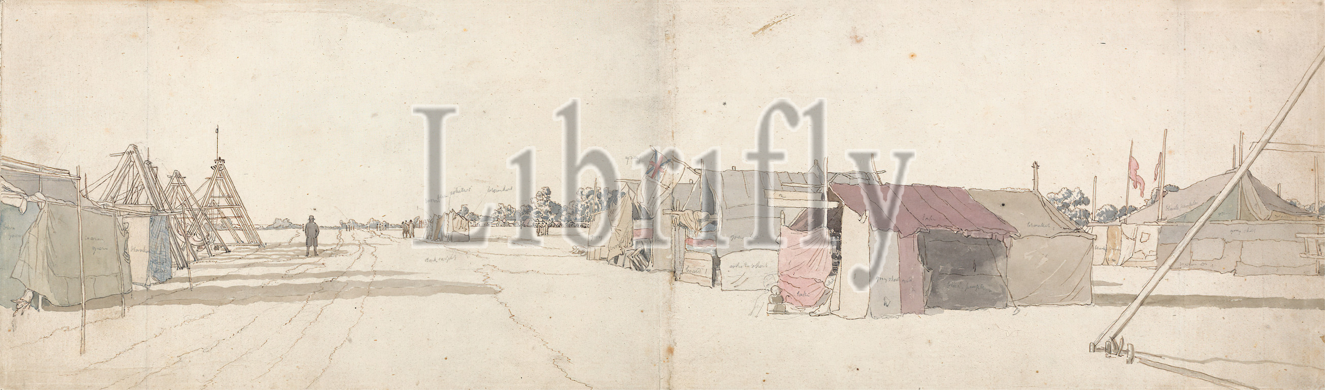 The Fair Grounds, Frederick Christian Lewis the Elder, 1779–1856, British, undated, Watercolor, pen and brown ink, and graphite on medium, slightly textured, cream laid paper, Sheet: 5 3/16 x 17 3/8in. (13.2 x 44.1cm) and Sheet: 5 1/8 × 17 3/8 inches (13 × 44.1 cm), architectural subject, dwellings, fair grounds, flags, street, tents, Union Jack
