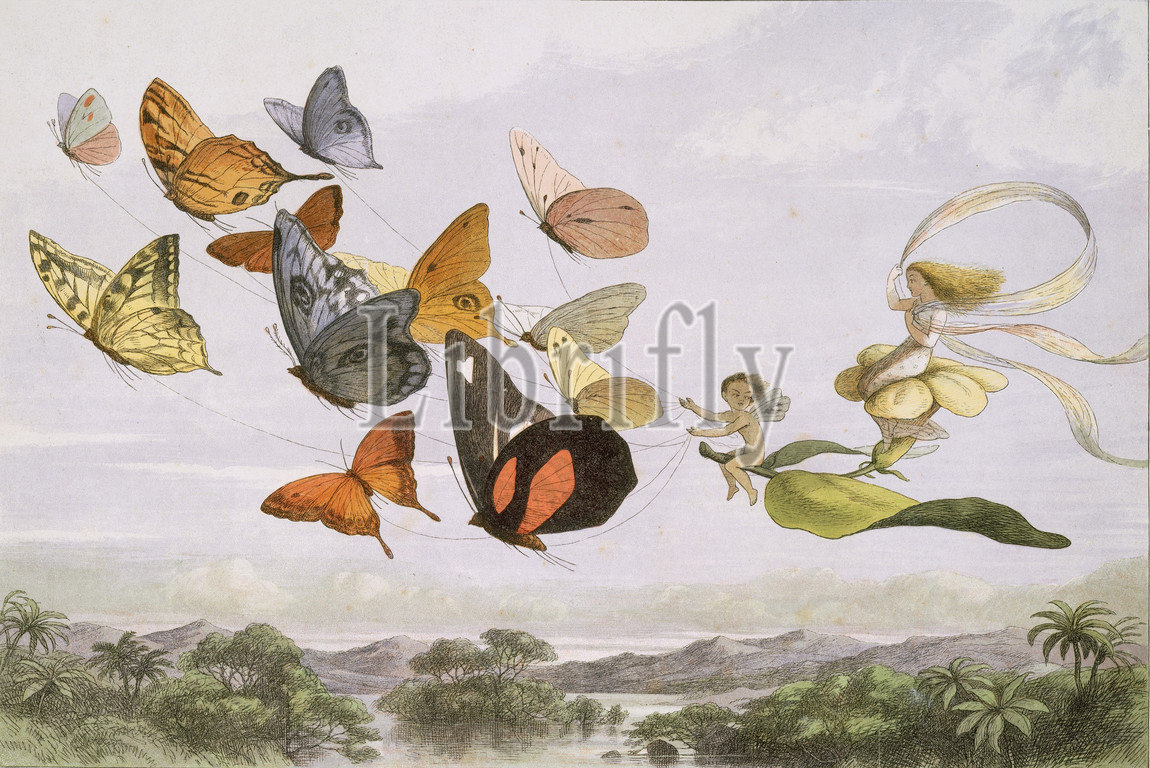 Fairy Queen Takes, Airy Drive, Light Carriage, Twelve, hand, drawn, Thoroughbred Butterflies, 1870, Color wood engraving, color lithography, Sheet, 10 11/16, 14 13/16, 27.2, 37.6 cm, Prints, Richard Doyle, British, London, 1824–1883