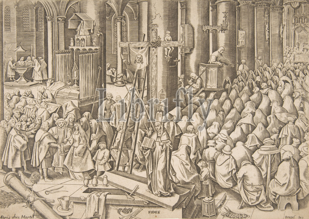 Faith (Fides) from The Virtues, ca. 1559–60, Engraving; second state of two, 8 1/8 x 11 7/16 in. (20.6 x 29 cm), Prints, Philips Galle (Netherlandish, Haarlem 1537–1612 Antwerp), After Pieter Bruegel the Elder (Netherlandish, Breda (?) ca. 1525–1569 Brussels)