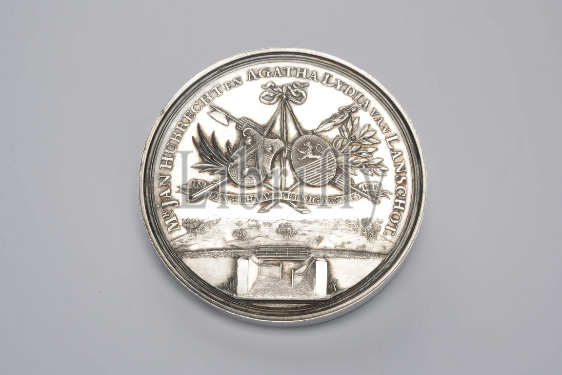 family medal, Johan George Holtzhey, 1793, minted, General: 5.4 x 0.4cm (54 x 4mm), Weight: 62.3g, minerva, dune landscape, double portrait, trophy, family crest, Silver medal on the golden wedding of mr. Jan Hubrecht and Agatha Lydia van Lanschot. The bride and groom are depicted on the front, with the man in a gown with an all-purpose wig on the left and the woman in a draped robe on the right. Between them a burning altar with on the front a snake biting itself in the tail with the letter L. The bride and groom press each other's hand above the altar. At the top the name Jehovah in Hebrew script surrounded by clouds and rays, and the inscription: HY WAS THE SOURCE OF ALL OUR HEYL. At the bottom the inscription: DEN 28 MEY MDCCXCIII. Marked on the cut. On the reverse a trophy consisting of two coats of arms with the arms of the Hubrecht and Van Lanschot family, a bundle with an ax, a staff with Minerva statue, a palm branch and an olive branch, bound together with a ribbon. Underneath a banderol with the inscription: IN DEN ECHT VEREENIGD 28 MAY 1743. Below in flatter relief a dune landscape with a hunter on the hunt, and in the foreground a dike with a lock and bridge. Description: Mr. JAN HUBRECHT AND AGATHA LYDIA VAN LANSCHOT. The medal has a profiled rim, 1913