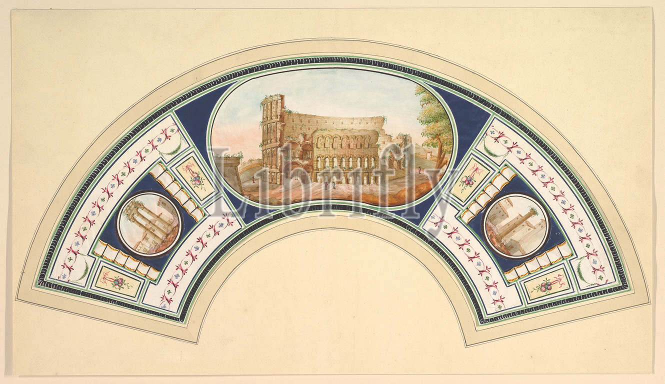 Fan Design with the Coloseum and the Temple of Vesta, 18th century, Watercolor and gouache on vellum ?, Drawings, Anonymous, Italian, 18th century