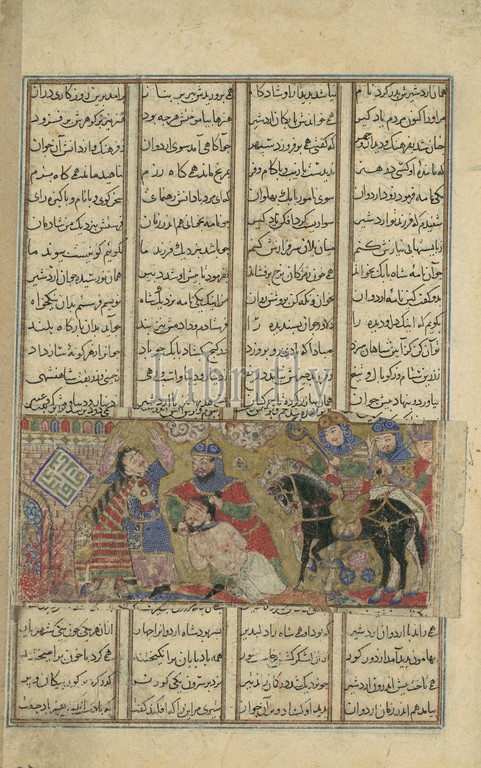 Faramarz Slays Varazad, Folio, Shahnama, Book, Kings, Abu'l Qasim Firdausi, ca, 1330–40, Attributed, Iran, Isfahan, Ink, opaque watercolor, gold, silver, paper, Page, 8 1/16 x 5 1/4, 20.5 13.3 cm, Codices, wars recounted, Persian epic, concern revenge, murder, pure-hearted Iranian prince, Siyavush, hands, Turanians, rarely illustrated, episode