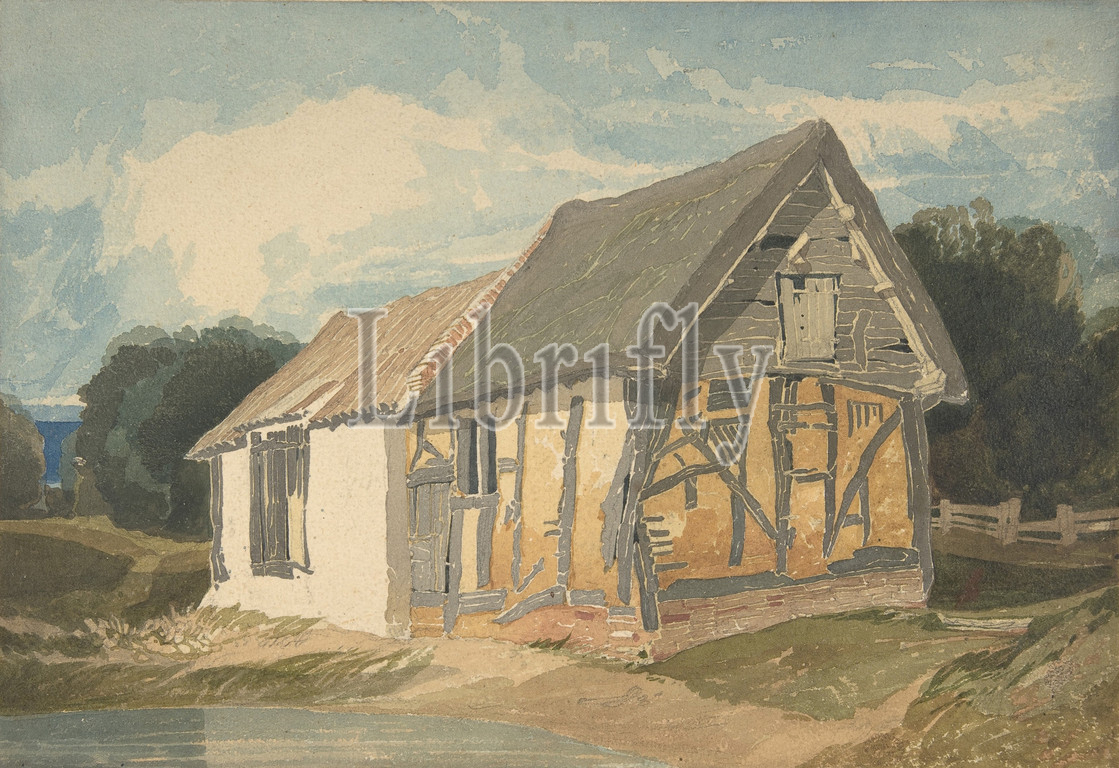 Farm Building, Pond, 1802–42, Watercolor, graphite, off-white wove paper, artist, board, Sheet, 8 7/8, 12 3/4, 22.5, 32.4 cm, Drawings, Attributed to John Sell Cotman, British, Norwich, 1782–1842, London