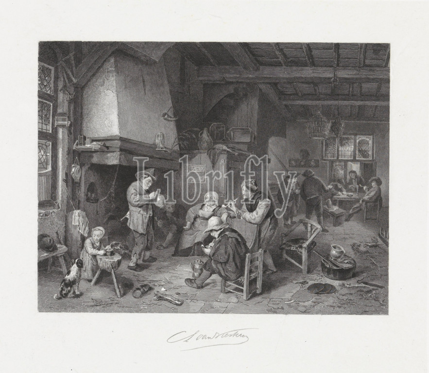 Farm company indoors, Inn interior, company, fireplace, foreground, men drink, smoke, left, girl, dog, print, stuck, wooden cupboard, cow horn hangs, Farmers sitting, standing, background, table, Pipe, tobacco, inn, coffee house, public house, etc, farmers, eg, engraving, etching, lithograph, Christiaan Lodewijk van Kesteren, mentioned, object, Amsterdam, 1861, paper, steel engraving