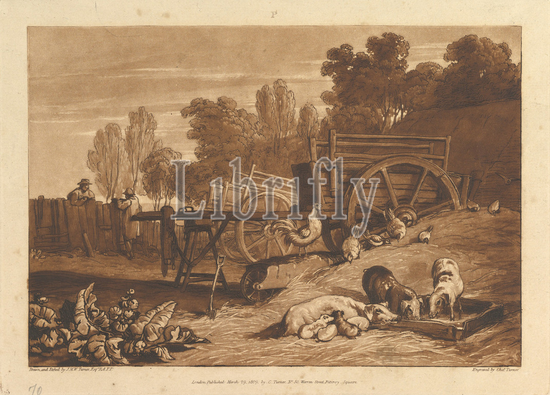 Farm-Yard, Cock, Liber Studiorum, part IV, plate 17, March 29, 1809, Etching, mezzotint, third state, three, Finberg, Plate, 7 1/16 x 10 5/16, 17.9 26.2 cm, Prints, Designed and etched by Joseph Mallord William Turner, British, London, 1775–1851, Turner distilled, ideas, landscape, Latin, Book, Studies, series, seventy prints, plus, frontispiece published, 1807, 1819, establish, compositions, brown watercolor, drawings, etched outlines, copper plates