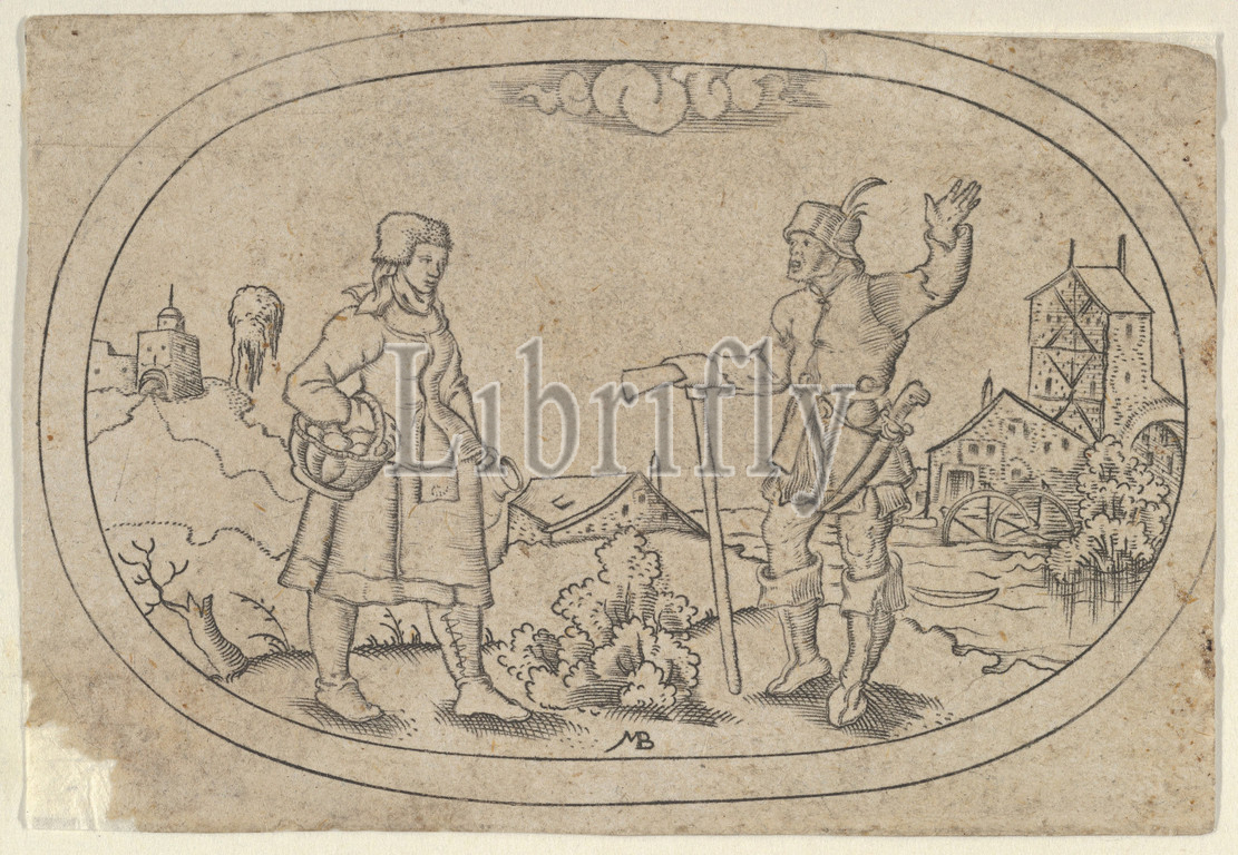 Farmers, from Das Bossenbüchlein, ca. 1582, Engraving, Sheet: 2 5/16 × 3 3/8 in. (5.9 × 8.5 cm), Mathais Beitler (German, Ansbach, active ca. 1582–1616), A male farmer at right greets a female famer, who carries a full basket at left. From a set of 12 plates of vessel designs.