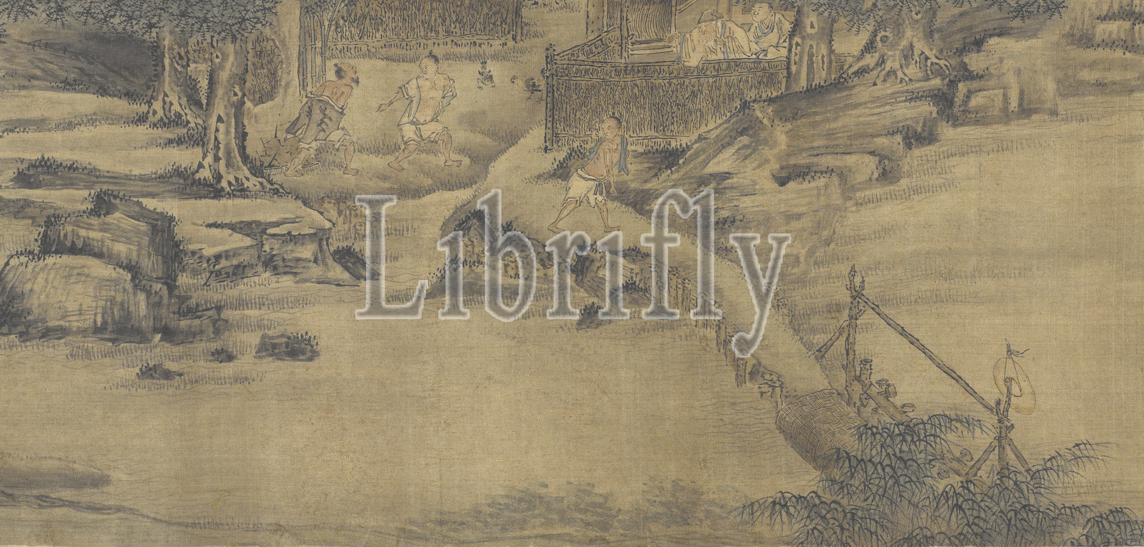 Farmers Fighting in Springtime, Zhang Chong (Chinese), Ming dynasty, period, Chongzhen, 1641, ink on silk, 8-1/2 x 28-11/16 in. (1st calligraphy) 8-1/2 x 70-1/2 in. (painting) 8-1/2 x 12-5/8 in. (2nd calligraphy), Signed: Zhang Zohng Artist seal: circular relief seal reads Ziyu Seal (unread): lower left on the end of the scroll Inscribed title by Chen Ruwei with 3 seals Colophon by Xie Wushan dated 1856 with 1 seal on painting, Asian Art