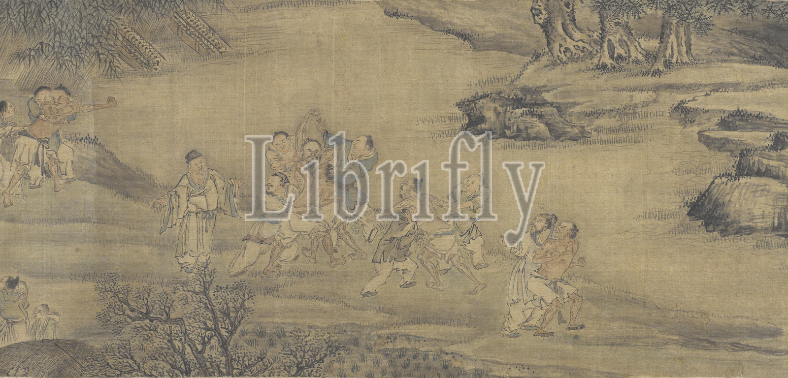 Farmers Fighting in Springtime, Zhang Chong (Chinese), Ming dynasty, period, Chongzhen, 1641, ink on silk, 8-1/2 x 28-11/16 in. (1st calligraphy) 8-1/2 x 70-1/2 in. (painting) 8-1/2 x 12-5/8 in. (2nd calligraphy), Signed: Zhang Zohng Artist seal: circular relief seal reads Ziyu Seal (unread): lower left on the end of the scroll Inscribed title by Chen Ruwei with 3 seals Colophon by Xie Wushan dated 1856 with 1 seal on painting, Asian Art