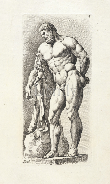 Farnese Hercules, 3/4 front, view, Signorvm vetervm, icones, Bisschop, Jan de 1628-1671, Doncker, Pieter Paul, Etching, 1731, 1741?, Statue, Herakles, Naples, Museo Nazionale, inv, no, 6001, Print, statue, reverse