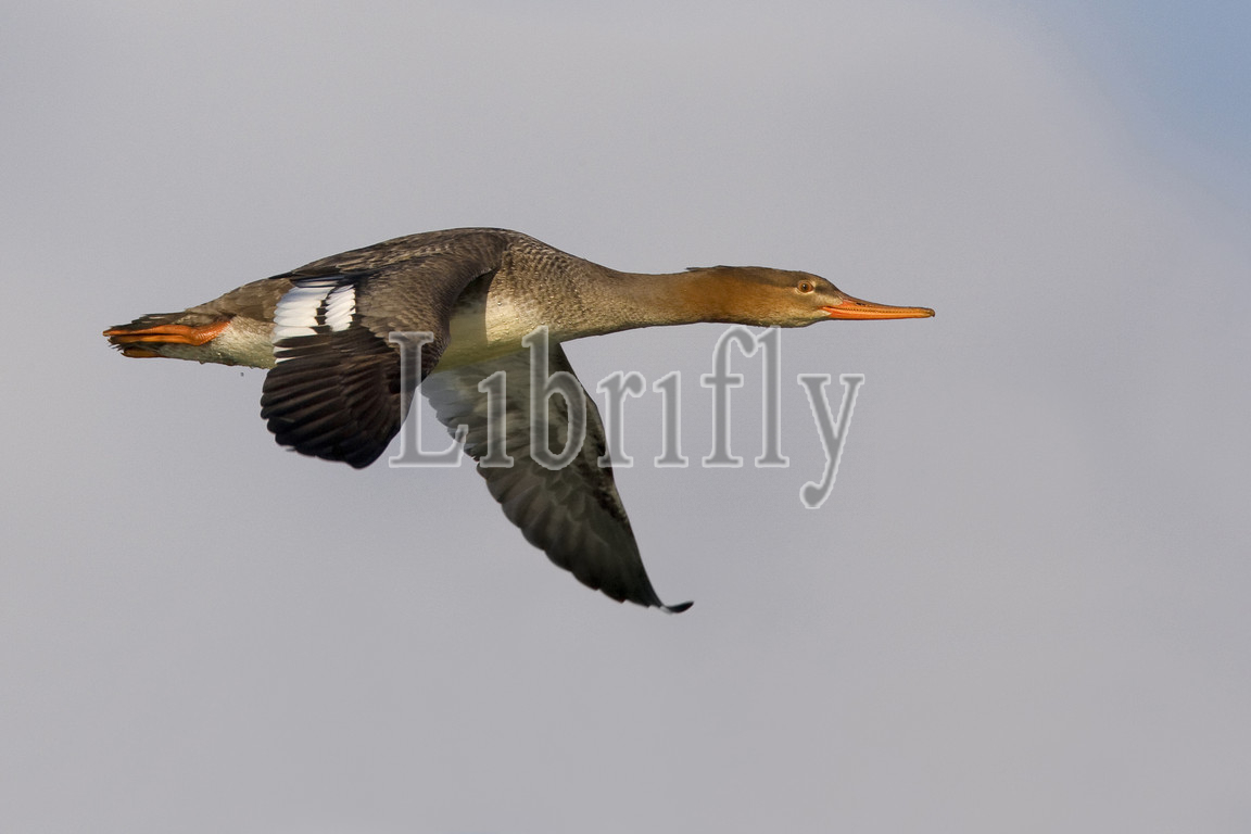 Female Red-breasted Merganser in flight, Mergus serrator, Italy