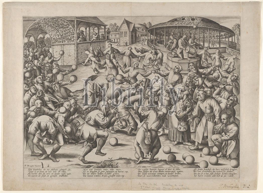 Festival, Fools, 1570, Engraving, second state, three, Sheet, 14 3/4, 19 15/16, 37.5, 50.6 cm, Prints, After Pieter Bruegel the Elder, Netherlandish, Breda, ca., 1525–1569, Brussels, Pieter van der Heyden