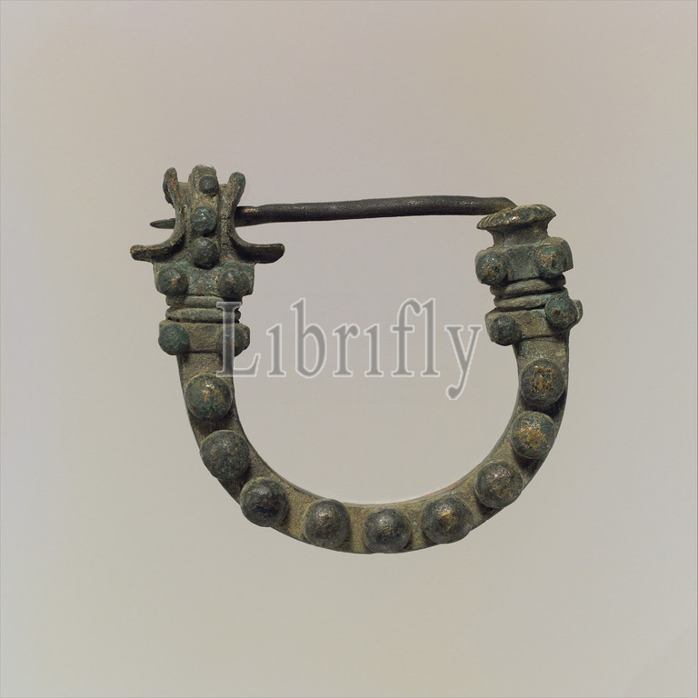 Fibula, Iron Age, ca, 8th–7th century B.C, Phrygia, Phrygian, Bronze, 2.32 x 0.67 2.76, 5.89 1.7 7.01 cm, Metalwork-Ornaments, Fibulae, ancient safety pins, long history, world, late second, millennium, B.C, Europe, Greece, flat arc, fibula, cast, semicircle, addition, hollow studs, applied, decoration, arc, catch, terminals, pin, added