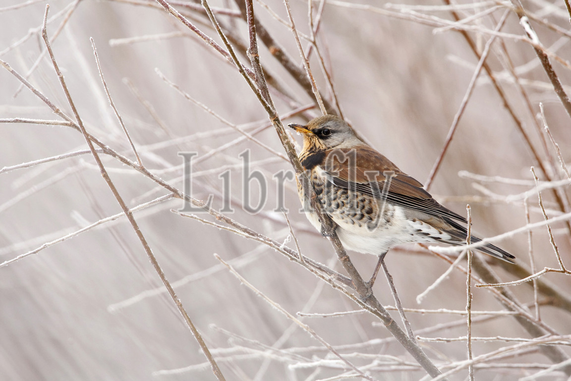 Fieldfare in scrub, Turdus pilaris, Netherlands