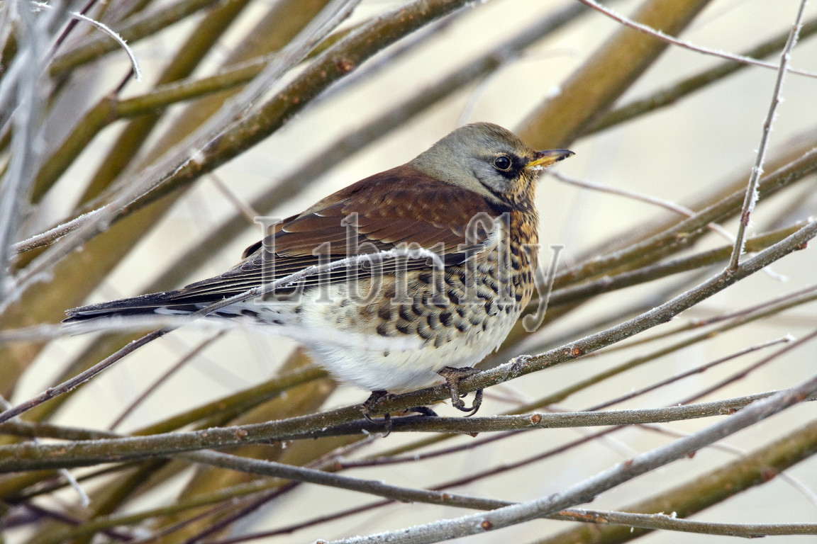 Fieldfare in scrub, Turdus pilaris, Netherlands