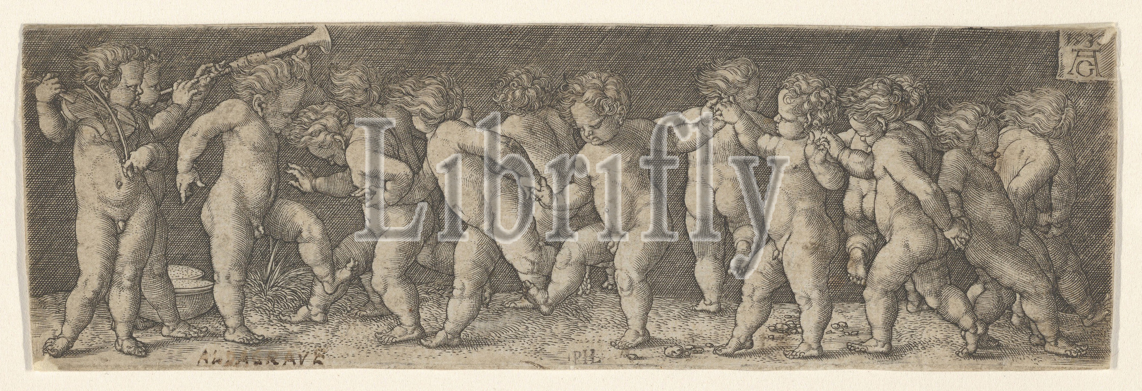 Fifteen Nude Children Dancing, 1535, Engraving, Sheet, 2 1/16, 6 1/2, 5.3, 16.5 cm, Heinrich Aldegrever, German, Paderborn ca., 1502–1555/1561, Soest, after Marcantonio Raimondi, Italian, Argini, ca., 1480–before, 1534, Bologna