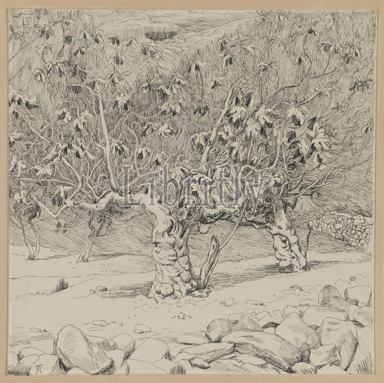 Fig-tree, Valley, Hinnom, Life, Our Lord Jesus Christ, La Vie de Notre-Seigneur Jésus-Christ, James Tissot, French, 1836-1902, Ink, paper mounted, board, 1886-1887, 1889, Sheet, 6 1/4 x 6 1/4, 15.9 x 15.9 cm, arid, Bible, Biblical, Catholicism, Christ, Christianity, dense, drawing, fig, fig tree, French, French Painting, fruit, gnarled, Hinnom, IMLS, Jesus, knobby, landscape, melted, New Testament, pen, ink, Religion, Religious, rock, rocks, rocky, sketch, split, stone, stones, tangled, Tissot, tree, trees