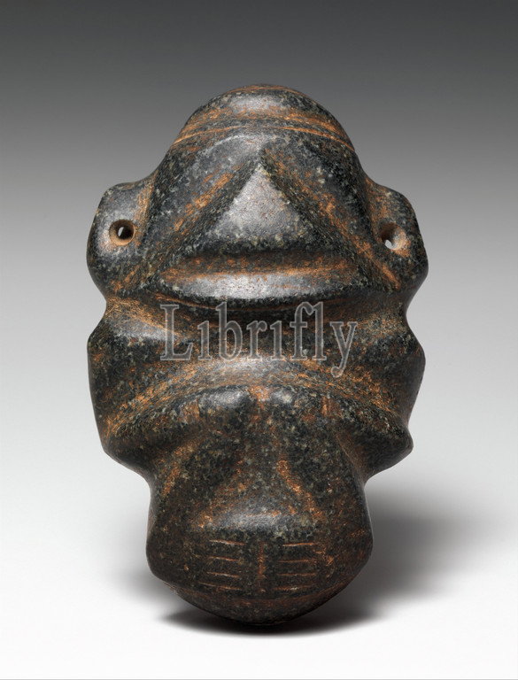 Figure, 13th–15th century, Dominican Republic, Caribbean, Taino, Diorite, granodiorite, Height 4-1/4, 10.8 cm, Stone-Sculpture, image, kneeling, crouching figure, pervasive, Taino art, Even, sculptures, almost flat, wide-mouthed, greenstone, legs, depicted bent, knee, feet flattened, ankle