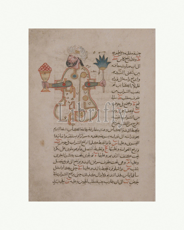 'Figure for Use at Drinking Parties', Folio from a Book of the Knowledge of Ingenious Mechanical Devices by al-Jazari, dated A.H. 715/A.D. 1315, Made in probably Syria, Ink, opaque watercolor, and gold on paper, 11.62 in. high 7.94 in. wide (29.5 cm high 20.2 cm wide), Codices