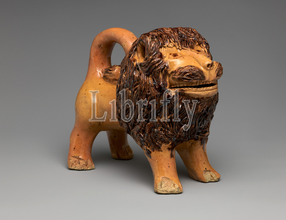 Figure of a Lion, 1845–55, Made in Waynesboro, Pennsylvania, United States, American, Earthenware, Height: 7 1/2 in. (19.1 cm), Ceramics, John Bell (American, Waynesboro, Pennsylvania, 1800–1880), This figure of a lion is quite simply the icon of American folk art in clay. With its jaunty stance and naïve half-smile, it exhibits a high degree of charming playfulness and whimsy. Made by John Bell (1800–1880) of the Shenandoah Valley family of potters, this lion is one of only four earthenware examples known (and one of stoneware), all with history of ownership with members of the Bell family, suggesting that these special pieces were reserved for loved ones rather than for sale to a local market