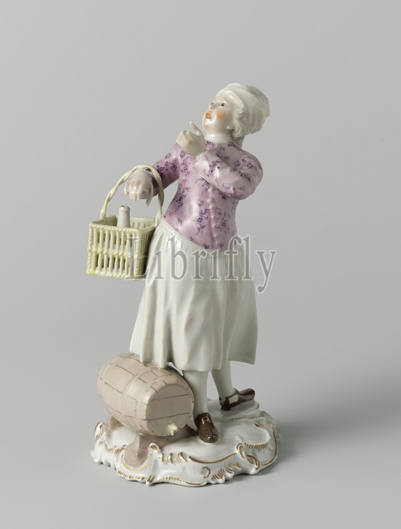 Figure, merchant, Porcelain statue painted, enamel, gold enamel, image represents, market trader, stands next, barrel, carries, basket, jug, bottle, arm, pedestal, decorated, seed beads, Marked, bottom, lion, monogram J.A.H, Joseph-Adam Hannong, Porzellanmanufaktur Frankenthal, Frankenthal, c, 1759, 1762, porcelain, material, glaze, gold, metal, vitrification