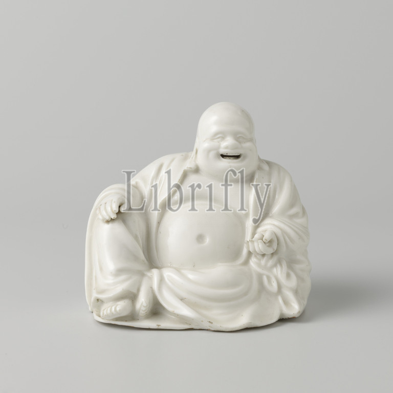 Figure of a seated monk, Porcelain statue covered with a translucent white glaze. Seated, smiling monk (Budai?) With a pearl in his hand and bare chest and belly. On the back an engraved and gilt unidentified character. Blanc de Chine., anonymous, China, c. 1800 - c. 1944, Qing-dynasty (1644-1912), porcelain (material), glaze, gold (metal), vitrification, h 14.5 cm l 15.5 cm × w 12 cm