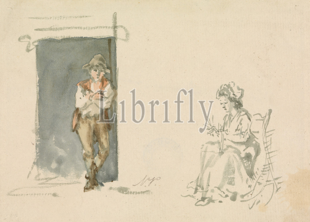 Figure Studies: Boy Standing, Nicholas Pocock, 1740–1821, British, undated, Watercolor on medium, slightly textured, cream laid paper, Sheet: 4 7/16 × 6 1/4 inches (11.3 × 15.9 cm), boy, chair, doorway, figure study, genre subject, hat, knitting, seated, standing, vest, woman