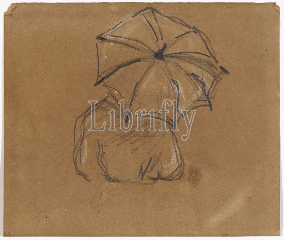 Figure with umbrella, seen from behind, 1866/69, black chalk and heights with white chalk on brown drawing paper, verso: pencil, sheet: 14.3 x 16.9 cm, on the back o. l., inscribed in pencil: Ma gracieuse Marie, Je vous aime et vous prie, De garder les mots d'écrit, Que vous envoient vos amis., Sur vos belles lèvres roses, Ce bonbon glissera bien, Il passe sur bien des choses, Sans en gâter le carmin., Ce joli bonbon rose, Si gentiment tourné, Dans une bouche rose, Serait heureux d'entrer, at the r., Edge fragment of another stanza, Paul Cézanne, Aix-en-Provence 1839–1906 Aix-en-Provence
