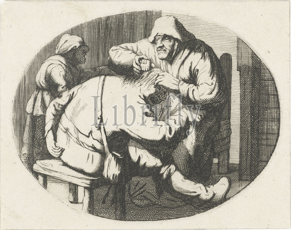 Figures, lice comb, Two sitting figures, interior, combing, farmers, comb, brush, tools, care, hair, stool, bag, men's clothes, Cornelis A, Hellemans, Northern Netherlands, 1650, 1699, paper, engraving