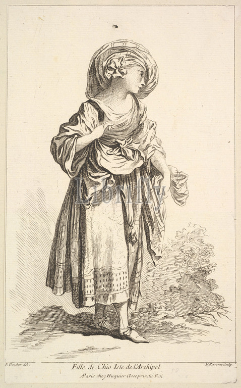 Fille de Cio isle l'Archipel, Recueil diverses fig.res étrangeres Inventées par F, Boucher P.tre du Roy et Gravées, Ravenet, Collection, Various Foreign Figures, Devised, F, Boucher, Painter, King, Engraved, etched, plate 10, 18th century, Etching, engraving, Sheet, 10 5/16 x 6 5/16, 26.2 16 cm, Prints, Simon Francis Ravenet, the elder, French, 1706, 1721–1774, After François Boucher, Paris, 1703–1770