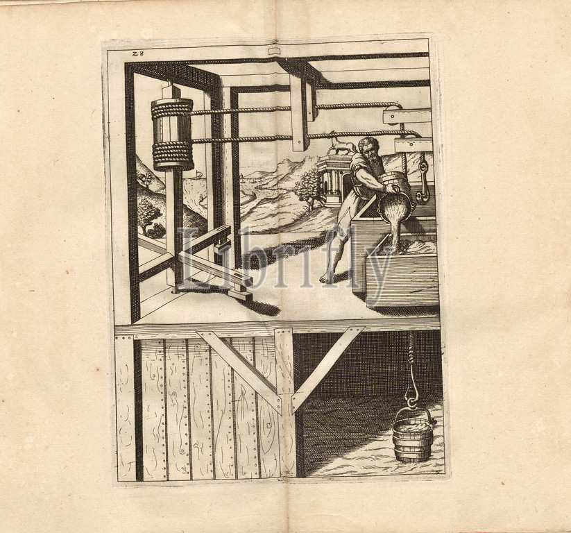 A fine kind of a drawing well, Drawing well, Fig. 28, after p. 18, p. 52, 1629, Iacobum de Strada à Rosberg: Kunstliche Abriss, allerhand Wasser-, Wind-, Ross- und Hand Mühlen, beneben schönen und nützlichen Pompen, auch andern Machinen, damit das Wasser in Höhe zuerheben, auch lustige Brunnen und Wasserwerck, dergleichen vor diesem nie gesehen worden: jetzo mit underschiedlichen Inventionen gemehret [...]. Franckfurt am Mayn: in Verlegung Octavii de Strada..., 1629