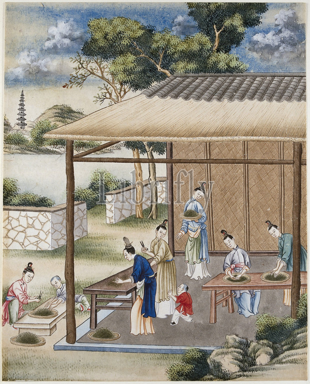Finely cutting, sorting, tea, two tables, veranda, four Chinese women, busy, cut, Furthermore, porch, child, woman, flat basket, Two seated figures, front, building, Part, group, four gouaches, production, export, Chinese tea, VOC, 1750, China, Dutch East India Company, c, 1770, paper, deck paint, gouache, paint, drawing