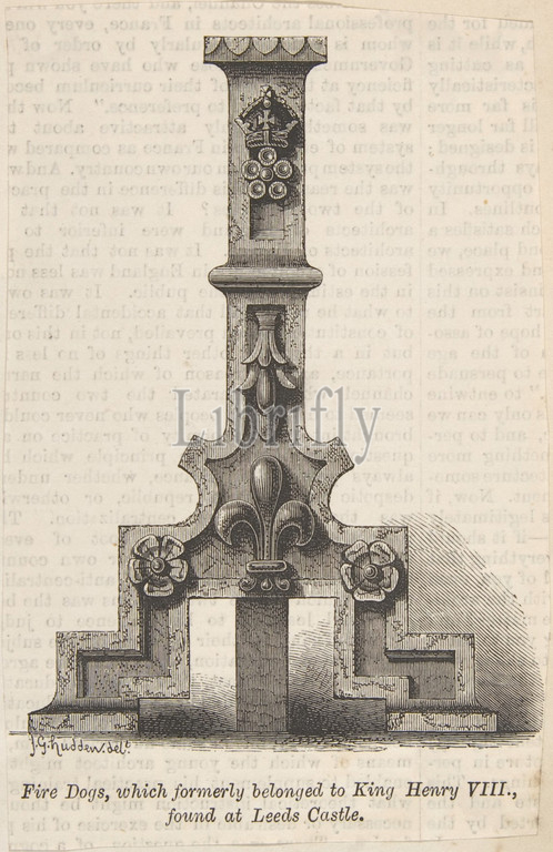Fire Dogs which belonged to King Henry VIII, formerly found at Leeds Castle, second half 19th century, Wood engraving, sheet: 4 7/16 x 2 15/16 in. (11.3 x 7.4 cm), Anonymous, British, 19th century