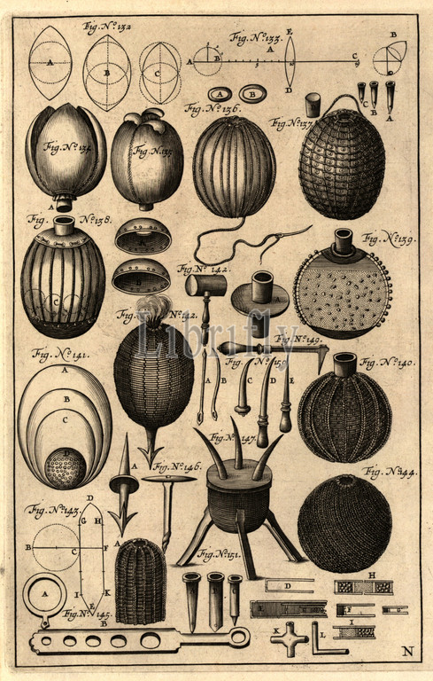 Fireworks 2, Copper engraving, Fig. 132-151, plate N, 1650, Casimiri Siemienowicz, Artis magnae artilleriae, pars prima, Amsterodami, Apud...Ianssonium, 1650
