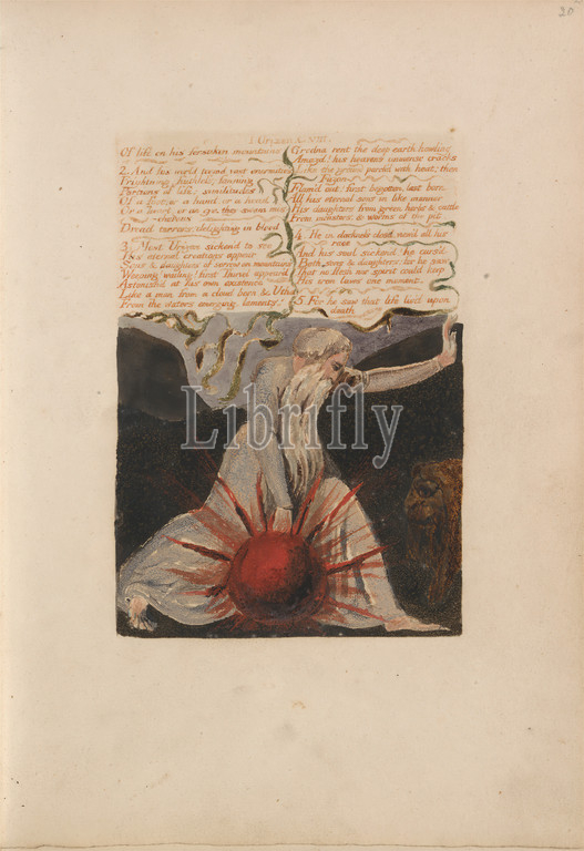 The First Book of Urizen, Plate 24, 'Of Life Forsaken Mountains....' (Bentley 23), Print made by William Blake, 1757–1827, British, 1794, Color-printed relief etching in orange-brown with watercolor on moderately thick, slightly textured, cream wove paper, Sheet: 10 x 7 1/8 inches (25.4 x 18.1 cm), Plate: 5 7/8 x 3 5/8 inches (14.9 x 9.2 cm), and Spine: 10 1/4 inches (26 cm), beard, fire, flames, globe, lantern, light, lion, literary theme, men, mountains, religious and mythological subject, text